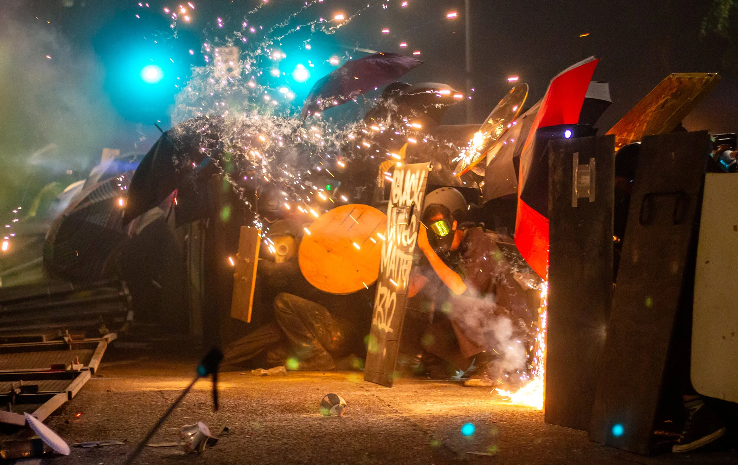 Sparks from a tear gas grenade rain down on shielded protestors as they advance slowly in unison toward the Multnomah County Justice Center on July 25, 205 in Portland, Ore. Law enforcement officers completely cleared the area around the Multnomah County Justice Center shortly after this photo was taken with tear gas, rubber bullets, mace and batons.
