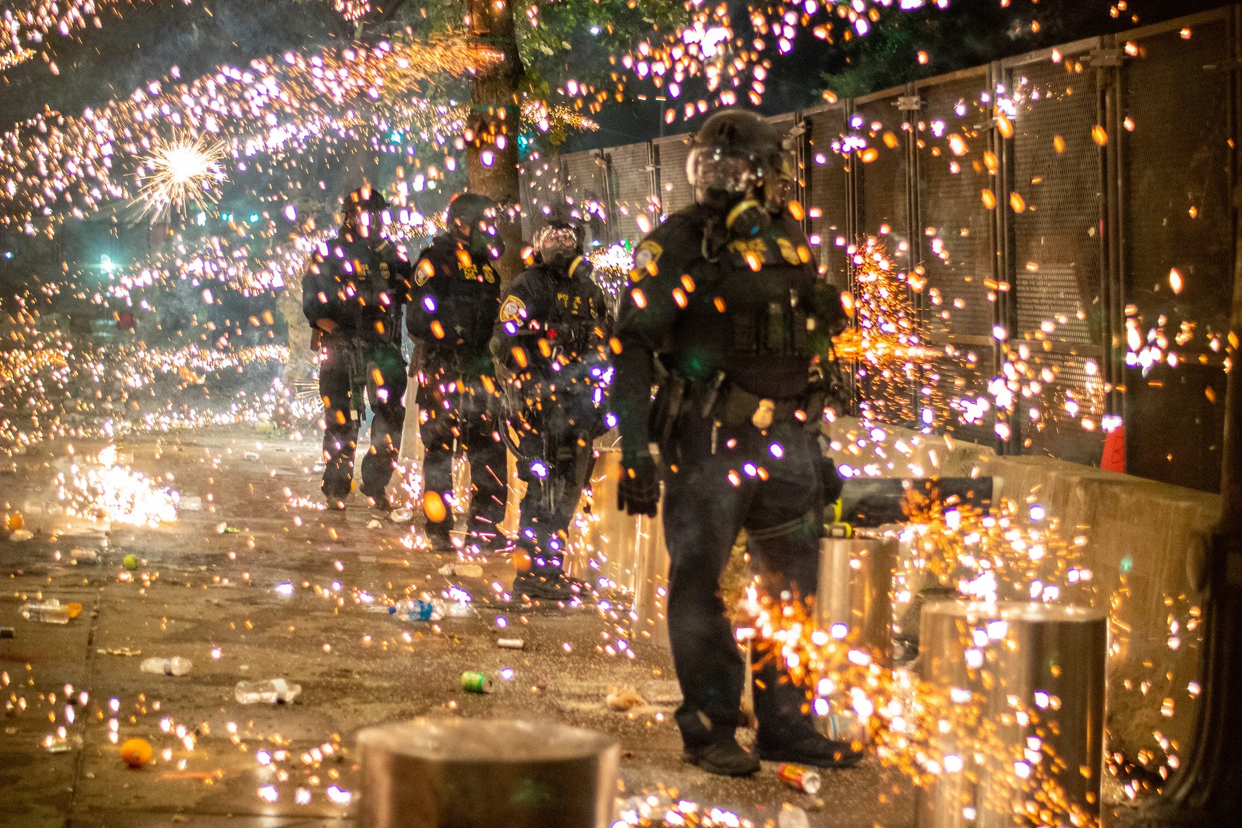 Artillery shell fireworks explode in a shower of sparks around unwavering police officers standing guard outside the Multnomah County Justice Center on July 24, 2020, in Portland, Ore.
